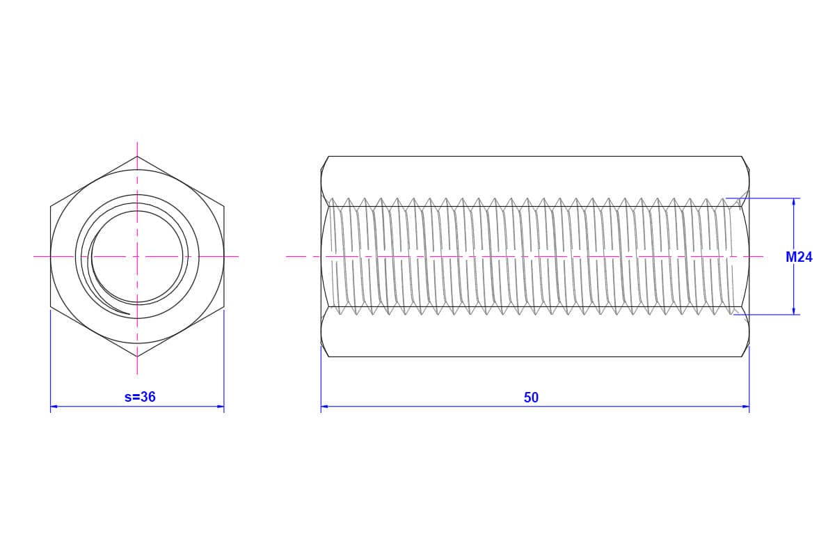 M24X50mm – 304 – Stainless Steel – Hexagonal Connector Nut