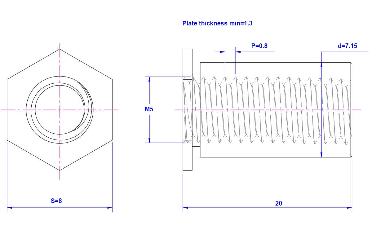 M5X20mm – White Zinc – Flat Head Hexagonal Self-Clinching Nut