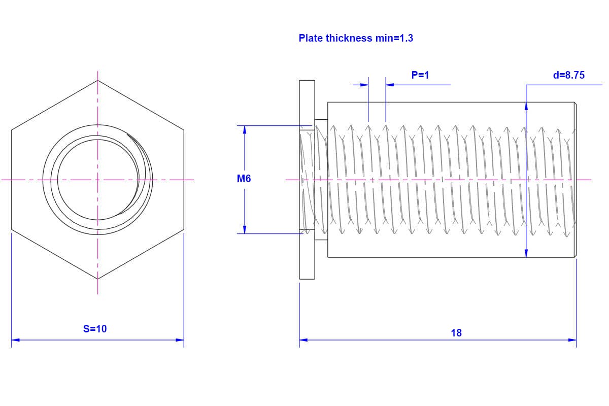 M6X18mm – White Zinc – Flat Head Hexagonal Self-Clinching Nut