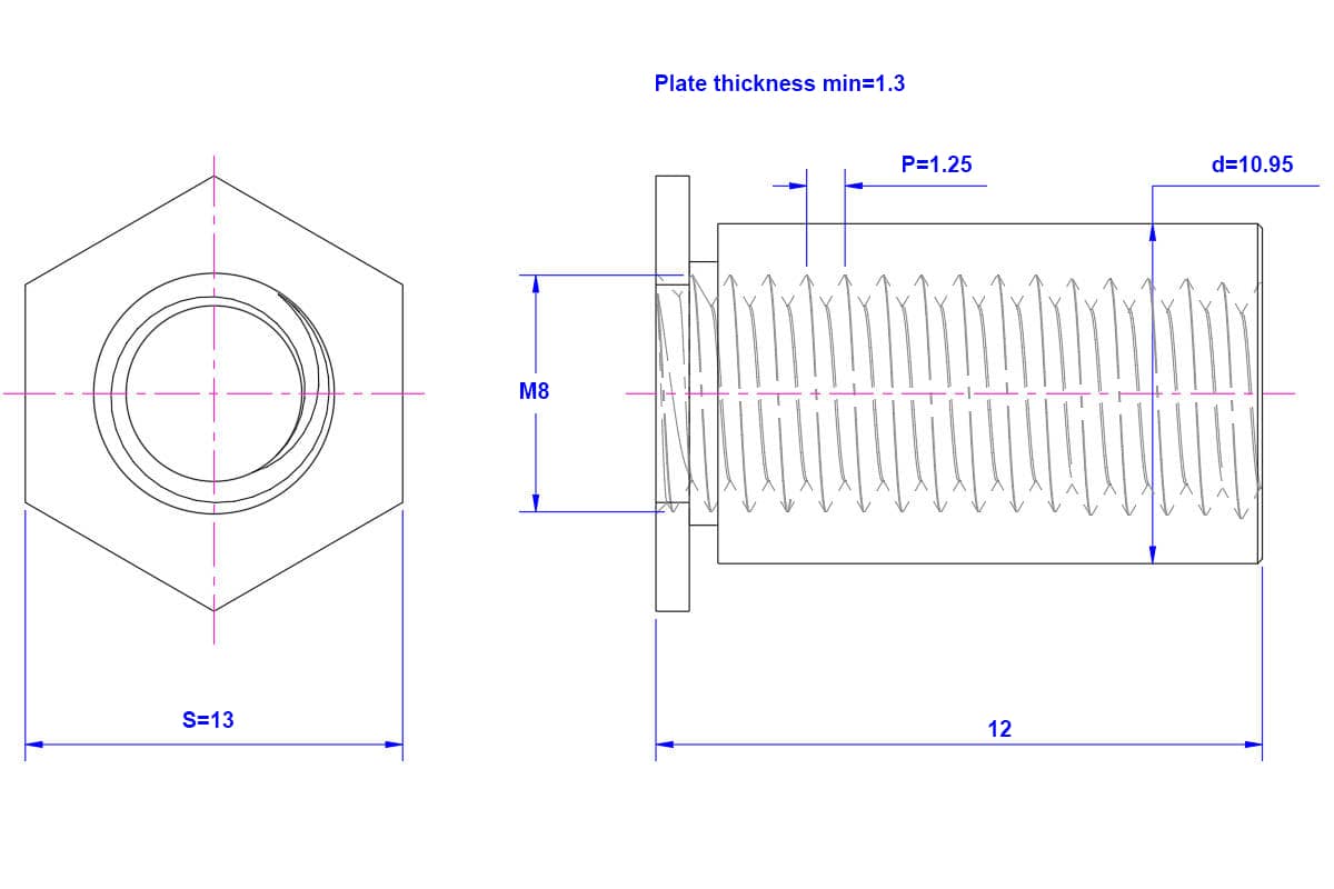 M8X12mm – White Zinc – Flat Head Hexagonal Self-Clinching Nut