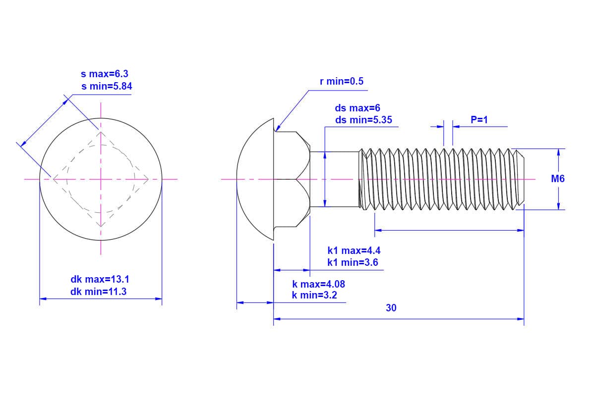 M6X30mm – 304 – Stainless Steel – Small head – Carriage bolt