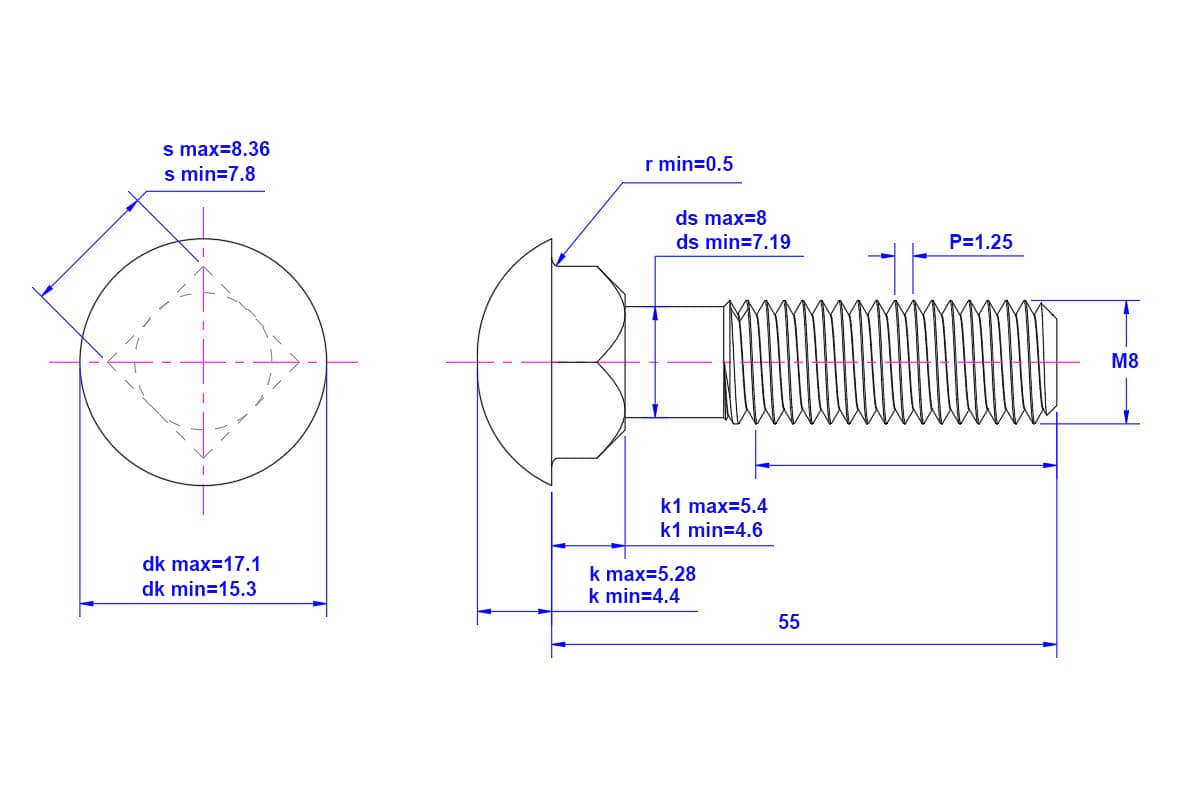 M8X55mm – 304 – Stainless Steel – Small head – Carriage bolt