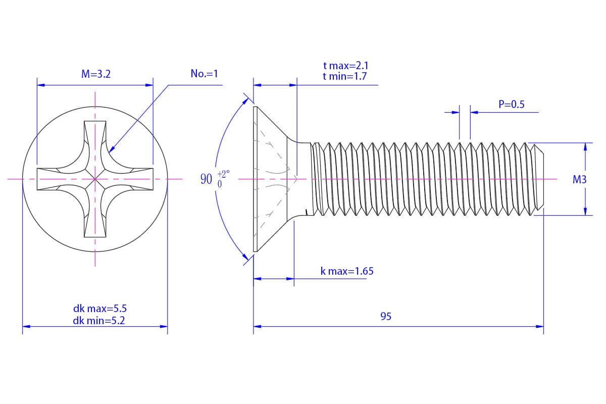 M3X95mm – 304 – Stainless steel – Countersunk cross-recessed screw