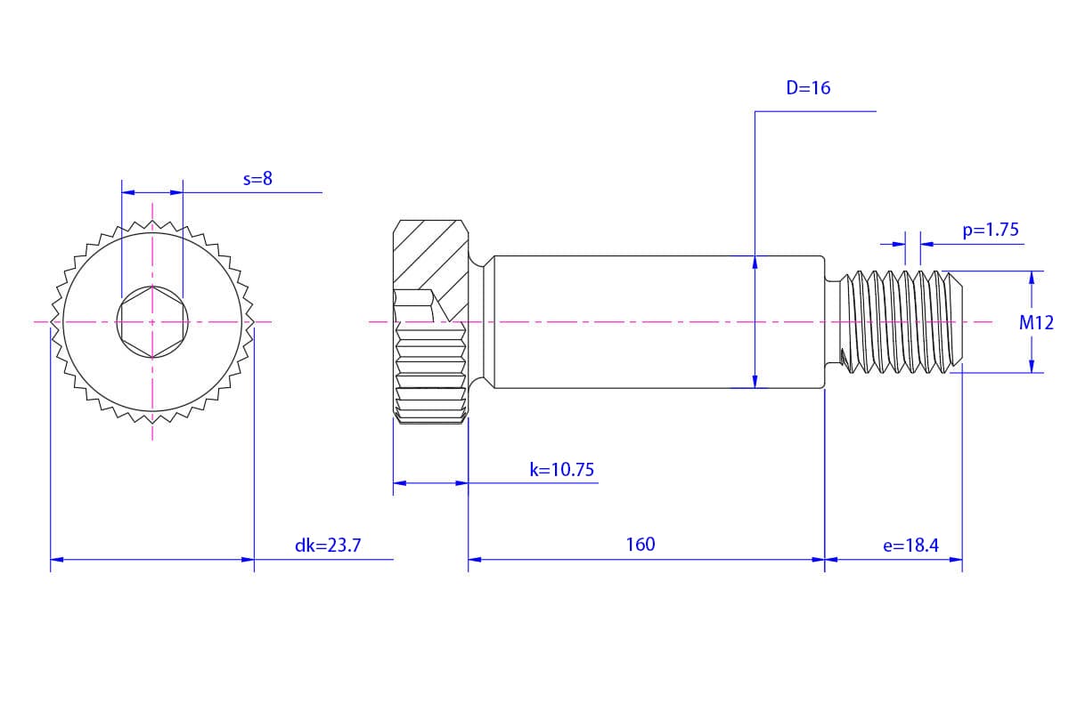 16xM12x160 – Grade 12.9 – Black Oxide – Knurled hexagon socket head shoulder screw
