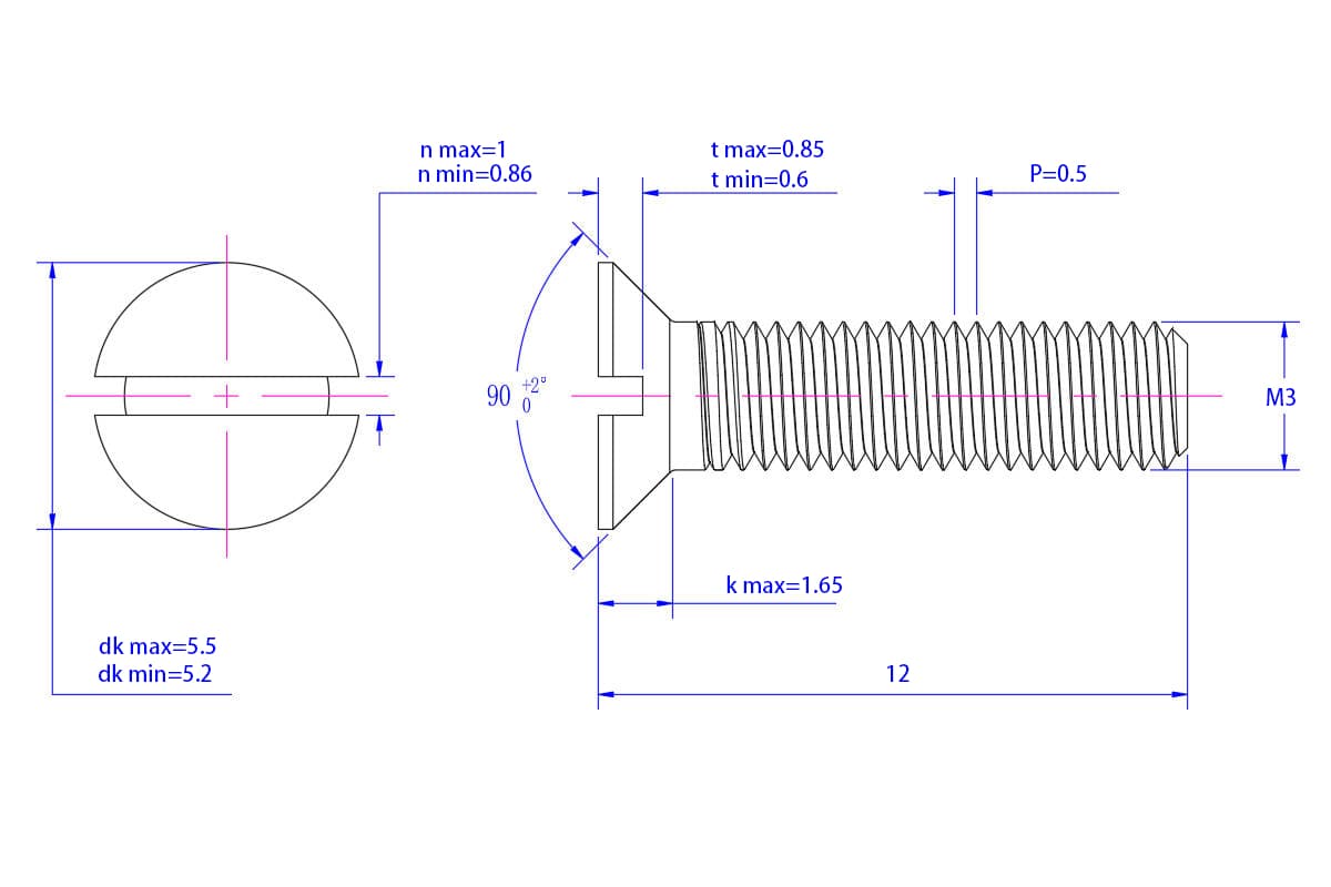 M3X12mm – 316 – Stainless Steel – Slotted countersunk flat head screw