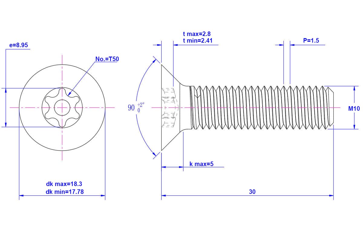 M10X30mm – 304 – Stainless Steel – Tamper-resistant Torx countersunk screw