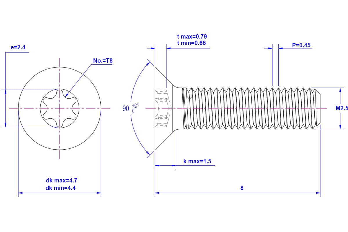 M2.5X8mm – 304 – Stainless Steel – Torx countersunk screw