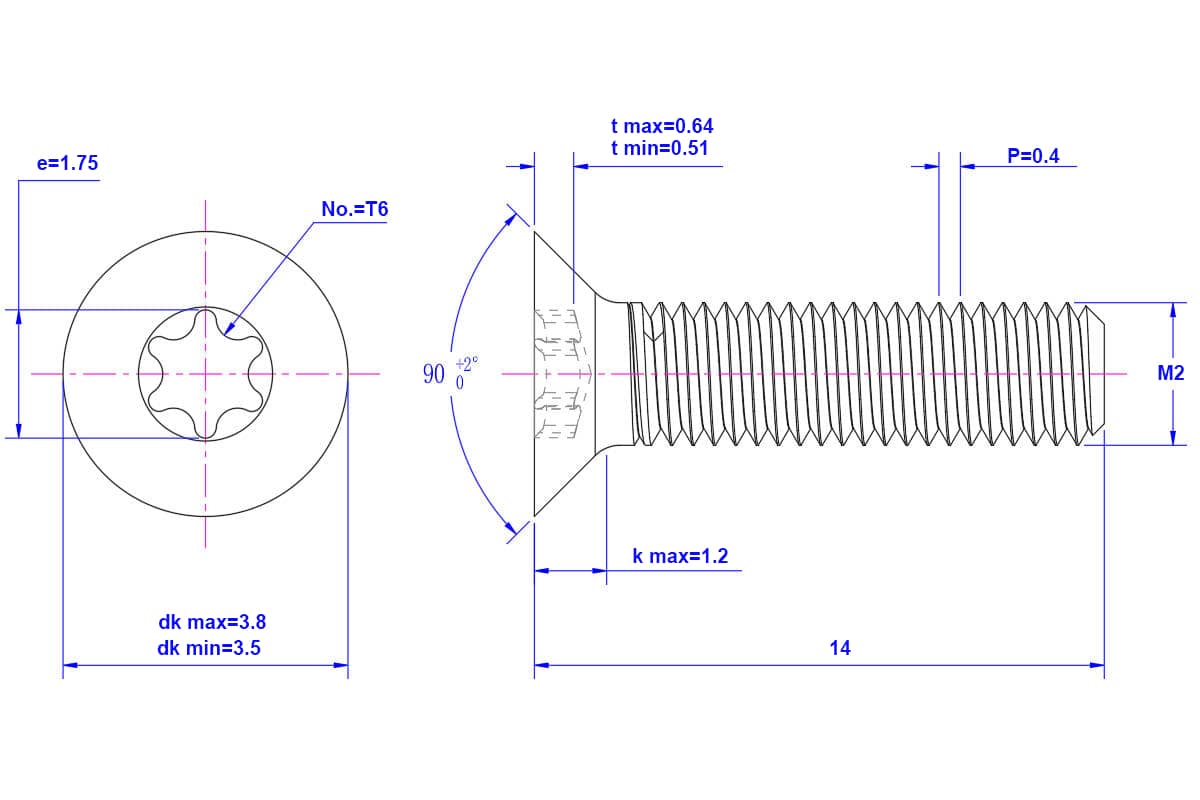 M2X14mm – 304 – Stainless Steel – Torx countersunk screw