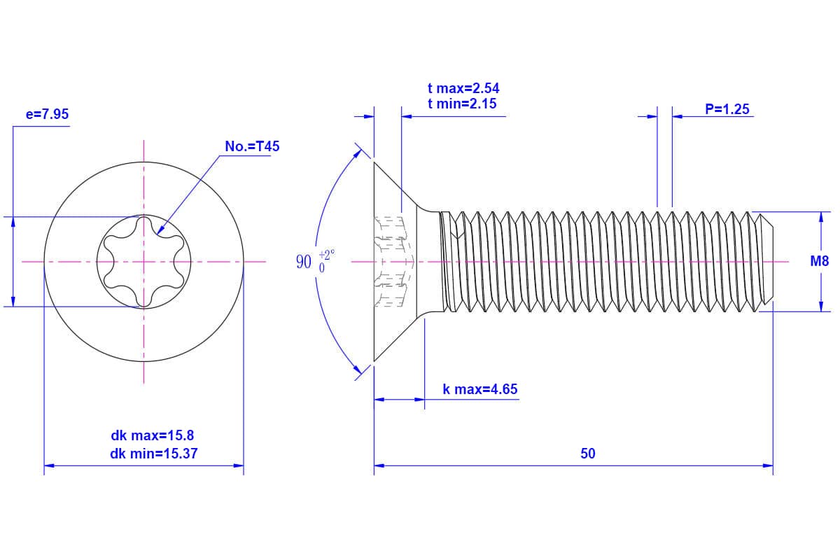 M8X50mm – 316 – Stainless Steel – Torx countersunk screw