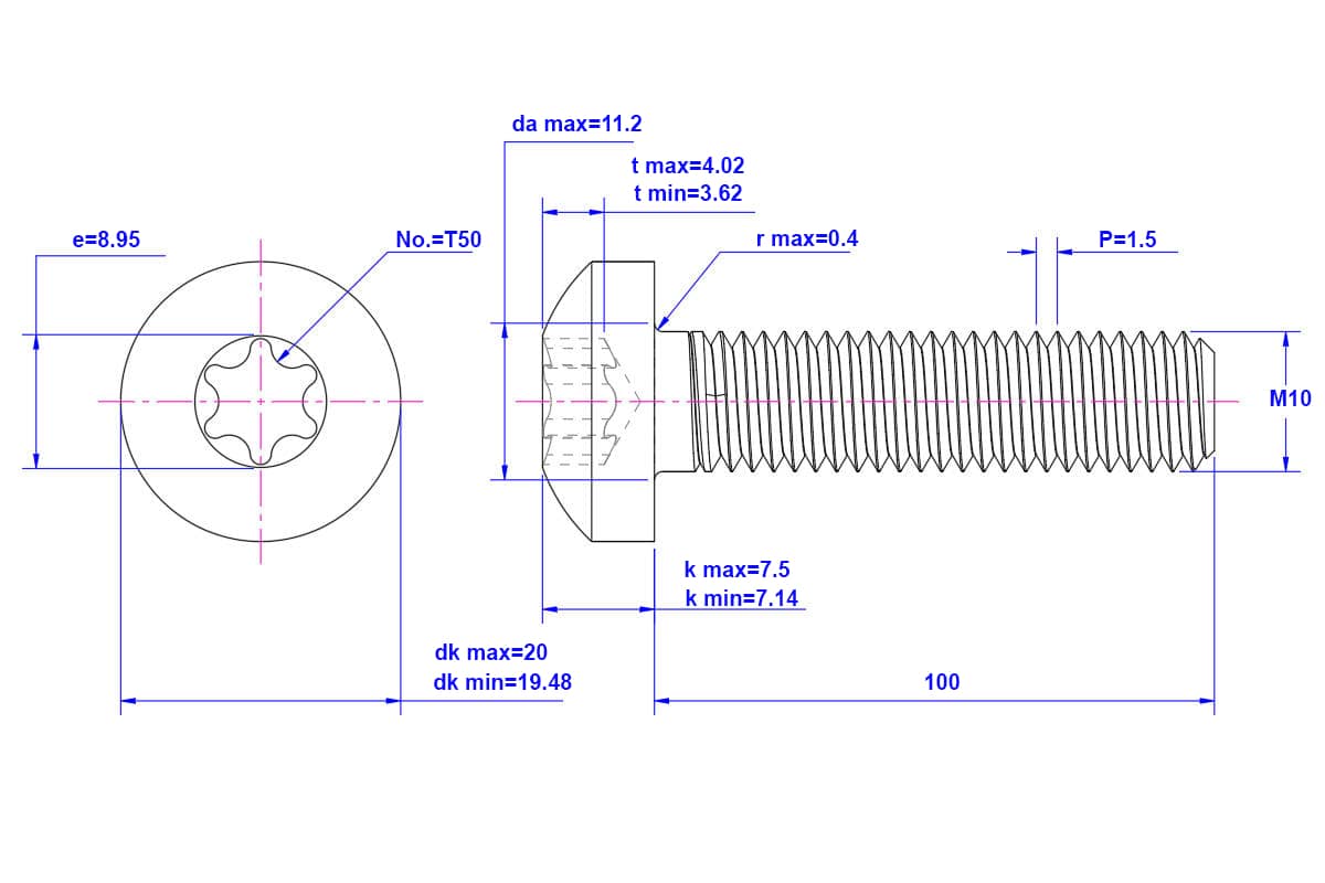 M10X100mm – 304 – Stainless Steel – Torx pan head screw
