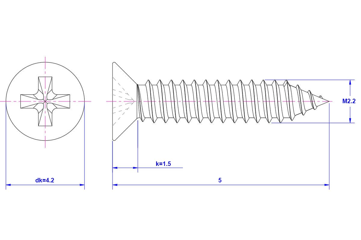Home Shop Self-tapping screws Cross Recessed Flat Head Self-Tapping Screw 316 - Stainless Steel - Cross Recessed Flat Head Self-Tapping Screw M2.2X5mm – 316 – Stainless Steel – Cross Recessed Flat Head Self-Tapping Screw